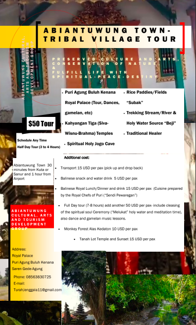 The Subak rice fields in Abiantuwung unfold in endless shades of green, gently swaying in the breeze under the warm sunlight. Sacred Tukad Yeh Sungi river is one of the major rivers in Abiantuwung and serves many functions, including channeling water to the coast, and holds a spiritual significance as it is used to carry cremation ashes, returning the body to nature. Duwe bojog protected monkeys lives in outer area of Abiantuwung with a population of hundreds inhabiting the sacred Joga Sakti cave forest and along the rivers. Found several holy sacred Beji natural spring water from underground following through for purification ceremony, spiritual soul and health.